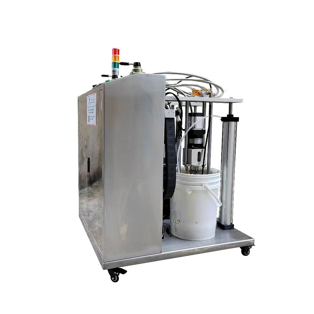 3. 压盘式自动打胶机适用于5加仑或20L/25L标准油桶或胶桶,可配三轴点胶机机械手适用于流水线作业,自动化程度高.