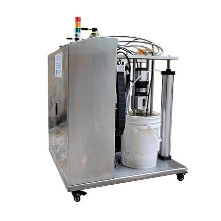 4. 使用时只需控制升降机构的开关,将压盘压入胶桶,打开气源开关,配合计量泵均匀出胶,不拉丝,无大头现象.