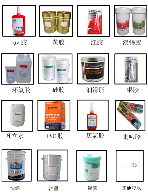 9、适用流体点胶,例如: UV胶、AB胶、EPOXY(黑胶)、白胶、EMI导电胶、SILICON、环氧树脂、瞬间胶、银胶、红胶、锡膏、散热膏、防焊膏、透明漆、螺丝固定剂等;
